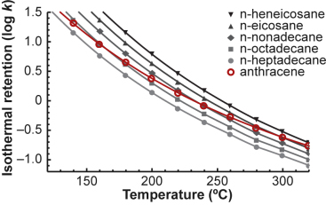 Even so, the accuracy of LRIs drop considerably when experimental conditions change from those originally used to measure them. The figure on the right shows why - it plots the isothermal retention (in terms of log k) of six compounds as a function of the temperature. Retention indexing assumes that anthracene (in red) will always elute at the same position between the two bracketing n-alkanes, but that is clearly not the case. For example, if we measured a retention index for anthracene at 140 °C and tried to use it at 320 °C, it would be terribly inaccurate. In fact, anthracene doesn't even elute between the same pair of n-alkanes at 320 °C - it elutes between the pair of n-alkanes three CH2 units longer than expected! Similarly, the more the temperature program, the flow rate/inlet pressure, or the column dimensions are changed from those originally used to measure LRIs, the more their accuracy generally drops. Even unavoidable differences between GC instruments can be enough to significantly reduce their accuracy. (Method translation, however, may be used to find a subset of experimental conditions for which retention indices should remain the same, but it greatly restricts the range of available experimental conditions and still cannot properly account for differences between GC instruments.)