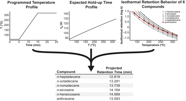 Still, the isothermal retention information shown in the previous figure can be easily measured, so another approach to predicting programmed-temperature retention is to calculate it (or "project" it) from the isothermal retention data. To do this, one can use the fundamental equation of programmed-temperature elution, plugging in the isothermal retention information for each compound along with the programmed temperature and hold-up time profiles (see below). Retention projection has the major advantage that it could accurately predict retention times with virtually any temperature program, flow rate/inlet pressure, film thickness, carrier gas type, and column dimensions, so long as the stationary phase material is chemically identical to that used to measure the isothermal retention data, because it accounts for the differences in a theoretically sound way.