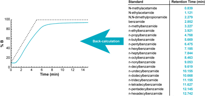 Rather than trying to directly measure the gradient, we discovered a much simpler, more accurate way to do it. We use the gradient retention times of a set of standards, spiked into the sample, to back-calculate what the gradient must have been to produce those retention times.