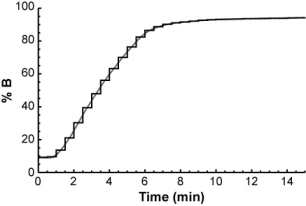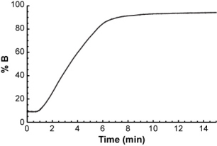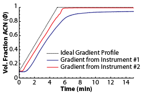 Unfortunately, this approach, by itself, isn't very accurate either (typically >10% error) because the actual gradient produced by an HPLC instrument isn't exactly what you program it to produce. Actual gradients usually differ considerably from the expected ones. On the right, you can see two gradient profiles measured from two different HPLC instruments, both programmed to produce the same 5 min gradient. Such gradient distortions must be taken into account to accurately project retention.