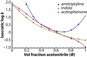Unfortunately, it's not that simple. In the figure on the right, isocratic retention vs. eluent composition relationships are plotted for three different compounds.