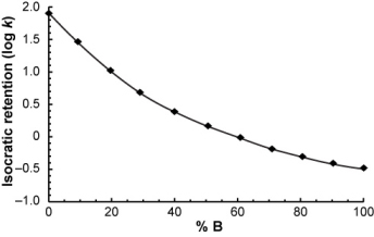To explain how gradient retention times are projected from isocratic data, suppose for a moment that you measured the isocratic retention of a compound over a range of mobile phase compositions...